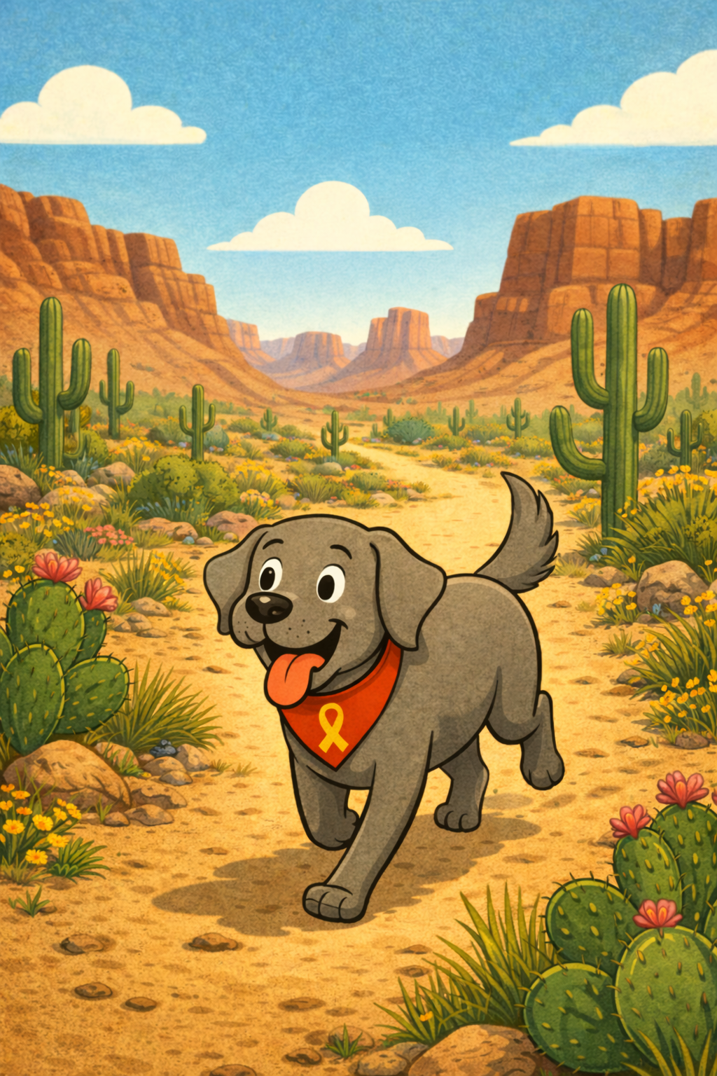 OdieBoy is a silver Weimaraner with bright eyes, a wagging tail, and a golden ribbon proudly displayed on his red bandana. More than a pet, he’s a steady presence in every step of the journey.